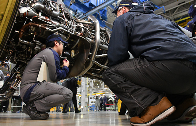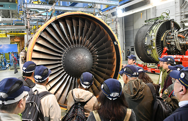 JALの767就航40周年記念イベントでCF6エンジンを見学する参加者=25年10月31日 PHOTO: Yusuke KOHASE/Aviation Wire