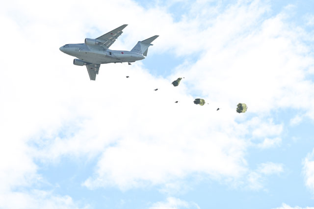 今年の展示飛行は、入間基地所属のC-2輸送機、U-680A飛行点検機、U-4多用途支援機、T-4練習機、CH-47J輸送ヘリコプターに加え、ブルーインパルスが参加。C-2から陸上自衛隊第1空挺団がパラシュート降下してスタートし、2機のC-2による急上昇、CH-47Jによる物資輸送など、隊員たちが日ごろの訓練の成果を披露した。