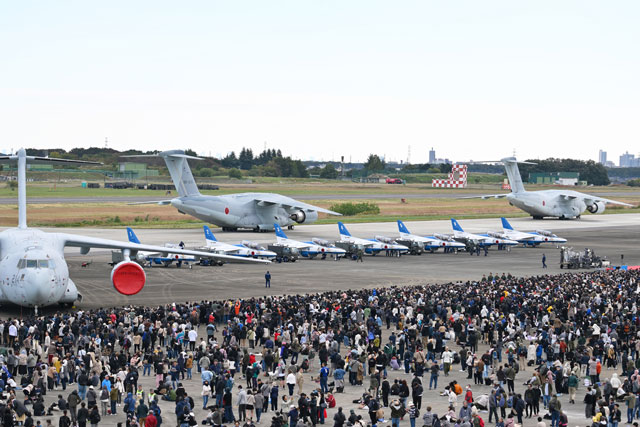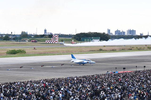 航空自衛隊入間基地で11月3日、入間航空祭が開かれ、アクロバット飛行チーム「ブルーインパルス」や基地所属機が展示飛行を披露した。入間基地によると、5年ぶりの一般公開となった昨年の25万人を上回る、約26万人が訪れた。