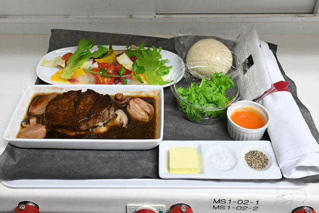 昨年羽田空港の訓練施設で初開催されたディナーショー「JAL Premium Night 2024」で提供したビジネスクラスの機内食=24年11月 PHOTO: Tadayuki YOSHIKAWA/Aviation Wire