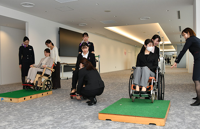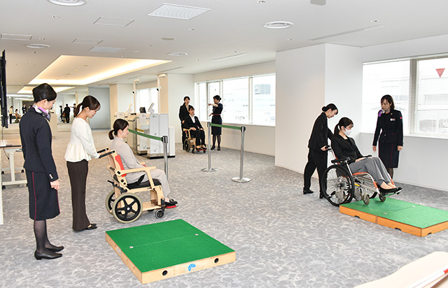 既存施設にあった訓練用のチェックインカウンターやゲートは、一部を移設したものの規模を縮小した。一方でリニューアル後は車いす利用客の訓練を充実させた。床に緩やかな坂を設け、搭乗橋(PBB)のスロープを再現するほか、段も設け、機内に入るときの段差も再現する。