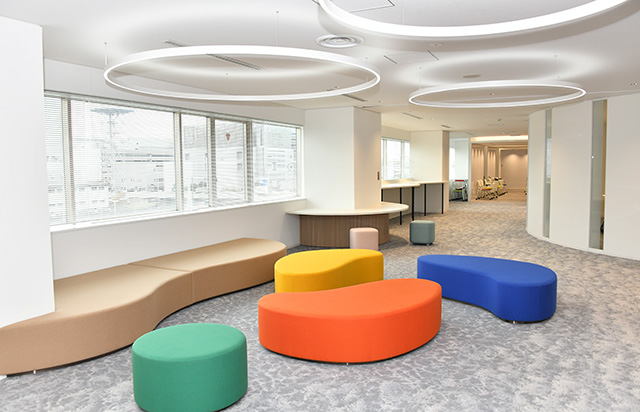 訓練を振り返る「フィードバックエリア」は、ロビーソファーを置くことで「教室のような作りにはせず、自然と話しができる雰囲気」(松本グループ長)を狙う。