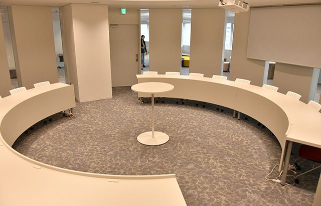 その後は「ディスカッションエリア」で意見交換し、互いの思考を深める。同エリアにはイス35脚と壁型のホワイトボードを設置。天井には円形の間接照明を採用することで、車座での対話を促す作りにした。