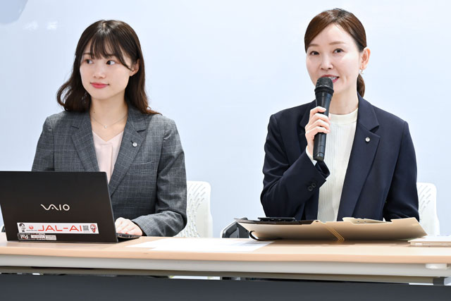 客室乗務員とグランドスタッフのスニーカー着用解禁を説明するJAL客室品質企画部企画・運営グループの関口明子氏(右)と空港企画部旅客サービス企画グループの松田理子氏=25年11月13日 PHOTO: Tadayuki YOSHIKAWA/Aviation Wire
