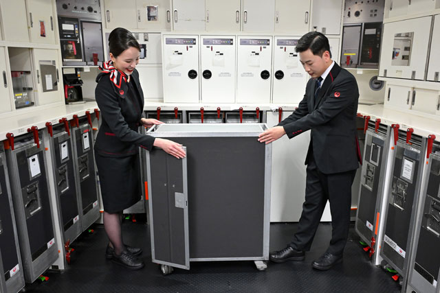 JALの訓練施設でスニーカーを着用してカートを操作する客室乗務員=25年11月13日 PHOTO: Tadayuki YOSHIKAWA/Aviation Wire
