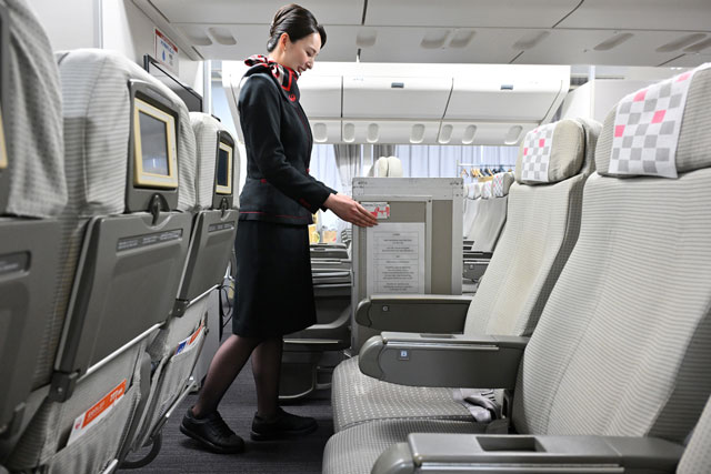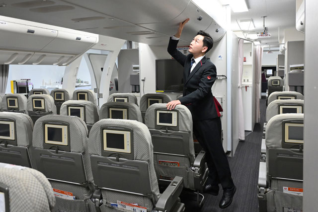 JALの訓練施設でスニーカーを着用して手荷物収納棚を確認する客室乗務員=25年11月13日 PHOTO: Tadayuki YOSHIKAWA/Aviation Wire