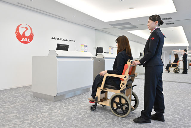 JALの訓練施設でスニーカーを着用して車いすを押すグランドスタッフ=25年11月13日 PHOTO: Tadayuki YOSHIKAWA/Aviation Wire