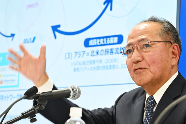 25年4-9月期決算を発表するANAHDの芝田浩二社長=25年10月30日 PHOTO: Tadayuki YOSHIKAWA/Aviation Wire