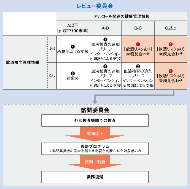 諮問委員会は「1」に分類されたパイロットを、専門的な見地から検査の要否、乗務の可否、乗務復帰の可否を総合的に検討する。委員会には精神科医と内科医、産業医が参画し、個人に応じた復帰プログラム作成する。乗務可否は委員会が判断し、会社(JAL)に諮問する。復帰への最終判断は会社が担う。