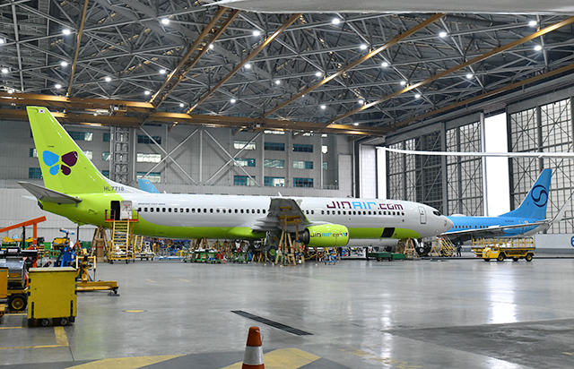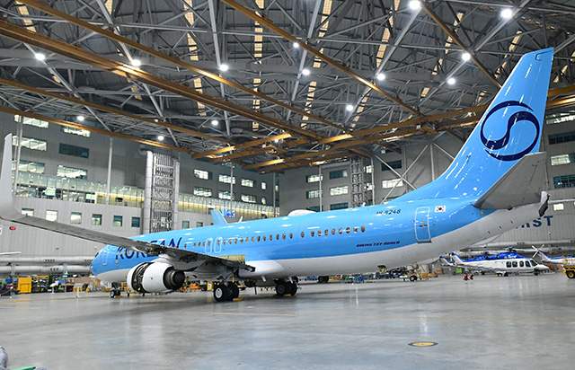 金浦空港にある大韓航空の格納庫で整備が進む新塗装を施した737-900ER=25年11月25日 PHOTO: Yusuke KOHASE/Aviation Wire