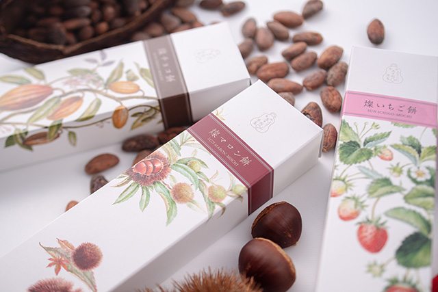 羽田空港で初めて取り扱う五十鈴茶屋の「燦マロン餅」のパッケージ(中央、赤福提供)