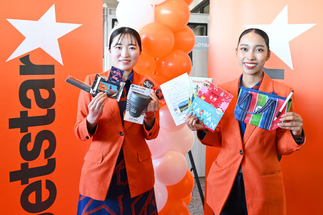 成田空港で高雄線就航の記念品を手にするジェットスター・ジャパンの客室乗務員=25年12月18日 PHOTO: Tadayuki YOSHIKAWA/Aviation Wire