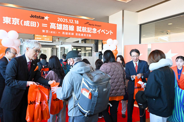 成田空港でジェットスター・ジャパンの高雄行き初便GK17便の乗客に記念品を手渡す阿部孝博会長(中央)ら=25年12月18日 PHOTO: Tadayuki YOSHIKAWA/Aviation Wire