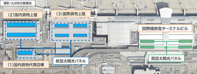 太陽光パネルは貨物地区にある国内貨物代理店棟と国内貨物上屋、国際貨物上屋それぞれの建物屋根に、1762ミリ×1134ミリのパネル計2643枚を新たに導入し、発電した電力を貨物地区と国際線地区へ供給する。年間の想定発電量は約1289MWh(メガワット時)で、CO2(二酸化炭素)を約500トン削減する見通し。PPA事業者は九電ネクストで、契約期間は20年間。
