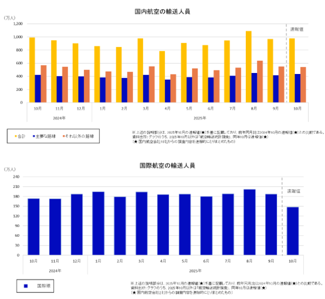 また、同時に発表した9月分の修正値は、国際線が前年同月比12.8%増の187万4000人。国内線は3.0%増の967万9000人で、このうち国内幹線が3.2%増の416万6000人、国内ローカル線が2.9%増の5,514 000人となった。