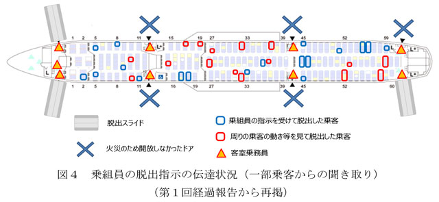 図4 乗組員の脱出指示の伝達状況(一部乗客からの聞き取り、第1回経過報告から再掲、JTSBの第2回経過報告から)