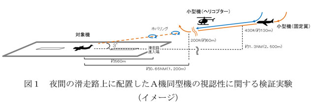 図1 夜間の滑走路上に配置した海保機同型機の視認性に関する検証実験のイメージ(JTSBの第2回経過報告から)