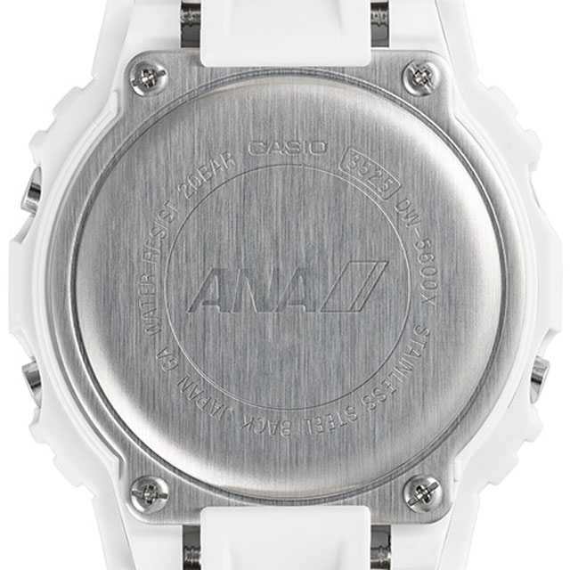 G-SHOCKを代表するスクエアモデル「DW-5600」をベースに、ANAらしさを随所に取り入れたという。機体をイメージしたマットなホワイトカラーを基調に、フェイスにはANAのブルーロゴを配置。バンド部分にはANAが就航する国内・海外空港の「3レターコード」をあしらい、飛行機が滑走路を進む様子をデザインした。LEDバックライトを点灯させると飛行機の機影が浮かび上がり、裏ぶたにはANAロゴを刻印した。専用ボックスも3レターコードを散りばめたオリジナル仕様となる。