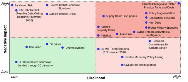 レポートは、発生可能性と世界経済への悪影響の大きさでリスクを分類したマトリックスを提示し、2026年に向けて警戒すべき領域を示した。