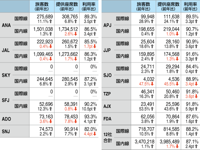 12社の発表値を合計すると、旅客数は国際線が前年同期比10.5%増の71万8707人、国内線は1.1%増の347万218人。提供座席数は国際線が8.8%増の81万4585席で、国内線は1.7%減の398万5489席となった。12社平均のロードファクター(座席利用率、L/F)は国際線が1.4ポイント上昇し88.2%、国内線は2.4ポイント上昇し87.1%だった。