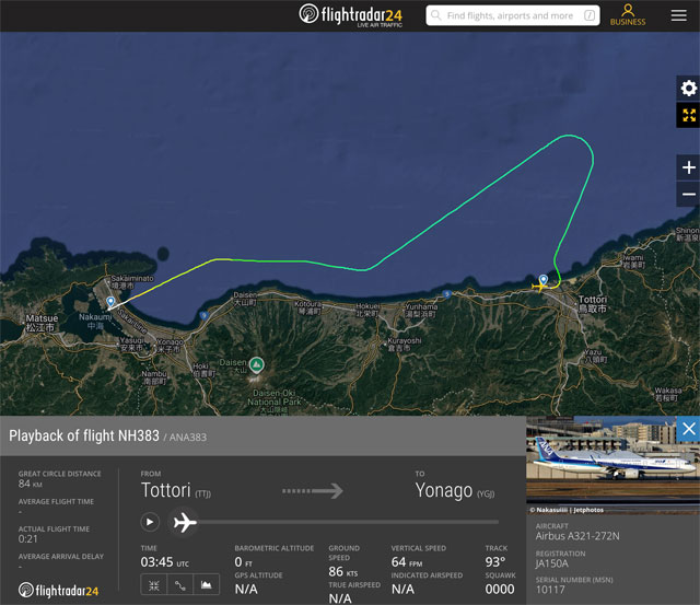 1月6日午前10時18分ごろ、島根県東部を震源に震度5強を観測する地震が起きた影響で、全日本空輸(ANA/NH)は羽田空港を午前9時1分に出発した米子行きNH383便(エアバスA321neo、登録記号JA150A)を鳥取空港へダイバート(目的地変更)後、米子空港へ鳥取から再出発させた。
