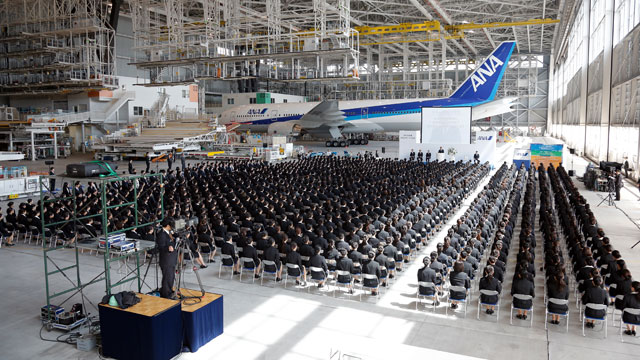 羽田の格納庫で行われたANAの入社式に列席するJA743A=13年4月1日 PHOTO: Tatsuyuki TAYAMA