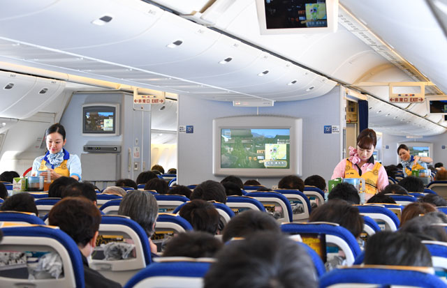 C-3POジェットで黄色いエプロンを着用して機内サービスするANAの客室乗務員=17年3月21日 PHOTO: Tadayuki YOSHIKAWA/Aviation Wire