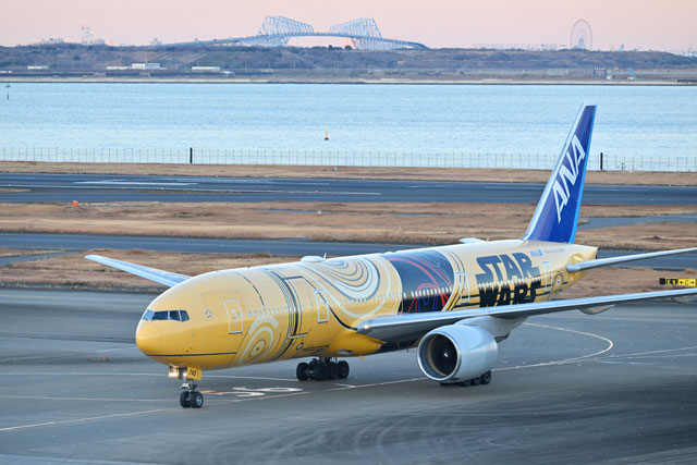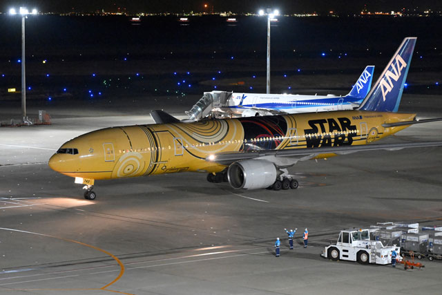 全日本空輸(ANA/NH)が運航する映画『スター・ウォーズ』の人気キャラクター「C-3PO」をデザインした特別塗装機「C-3PO ANA JET」(ボーイング777-200ER型機、登録記号JA743A)の羽田発最終便となった福岡行きNH265便が1月9日午後、61番スポットから出発した。折り返しの羽田行きNH270便で、8年9カ月におよぶ運航を終え、通常塗装に塗り替えられる。最終便となるNH270便の羽田到着は、定刻より15分遅れの午後9時45分を見込んでいる。