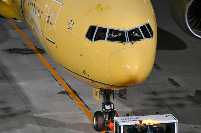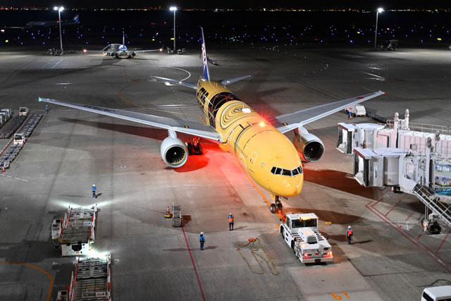 ・ANA、C-3POジェット就航 黄色いエプロンでCA出迎え(17年3月21日)
