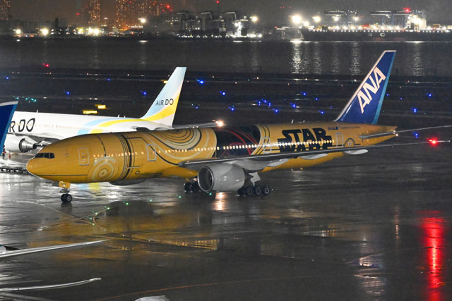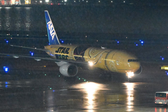 全日本空輸(ANA/NH)が運航する映画『スター・ウォーズ』の人気キャラクター「C-3PO」をデザインした特別塗装機「C-3PO ANA JET」(ボーイング777-200ER型機、登録記号JA743A)の商業運航最終便となった福岡発羽田行きNH270便が1月9日午後10時すぎ、羽田空港の58番スポットに到着した。2017年3月21日の就航から3217日、年数では8年9カ月におよぶ運航を終え、通常塗装に塗り替えられる。