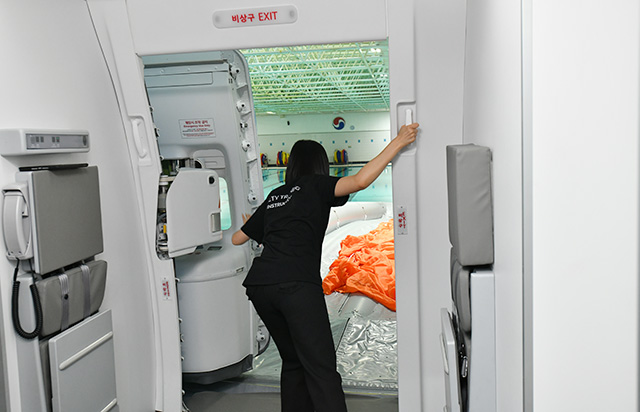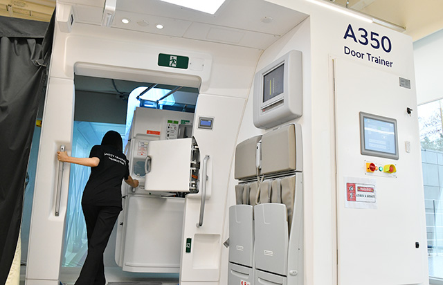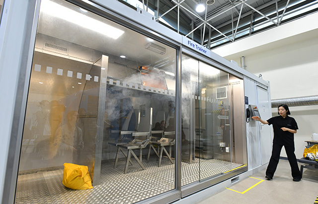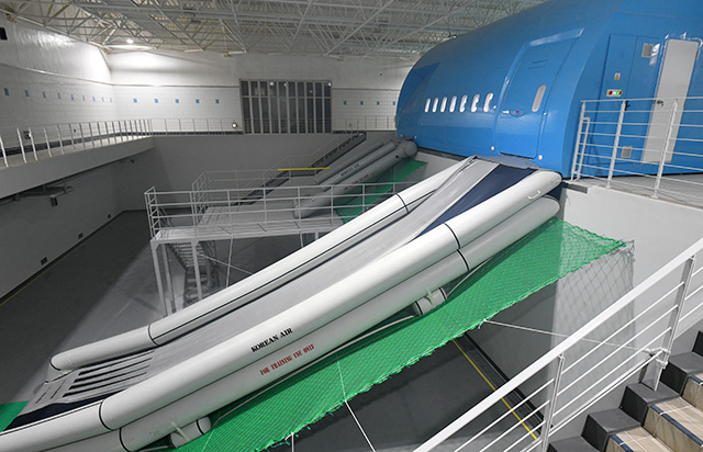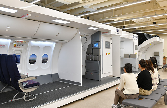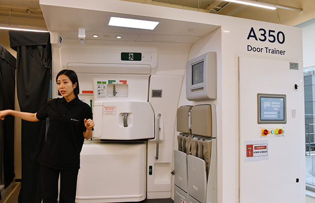 CAの訓練施設はソウル・金浦空港近くにあり、ドア操作や緊急脱出などを訓練する「ドアトレーナー」は最新機種のA350を含め、大韓航空が保有する全9機種に対応する。取材した当日は、タイなど多国籍で構成するCAの訓練生が訓練を受けていた。