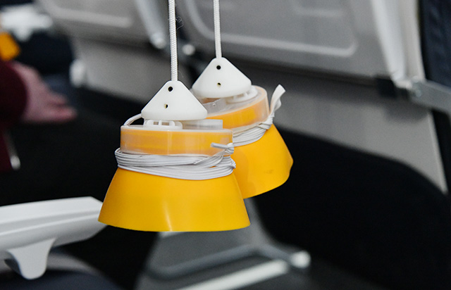 大韓航空のCAが着用方法を学ぶ酸素マスクを出す際に使うコントローラー=25年11月25日 PHOTO: Yusuke KOHASE/Aviation Wire
