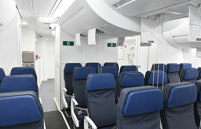 酸素マスクが出た状態の大韓航空のA350を模した訓練施設=25年11月25日 PHOTO: Yusuke KOHASE/Aviation Wire