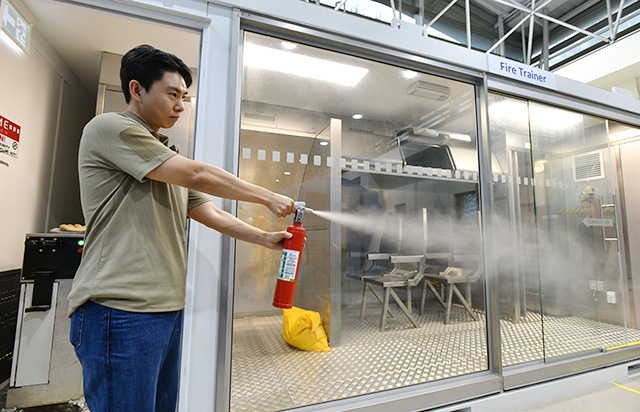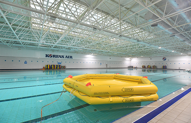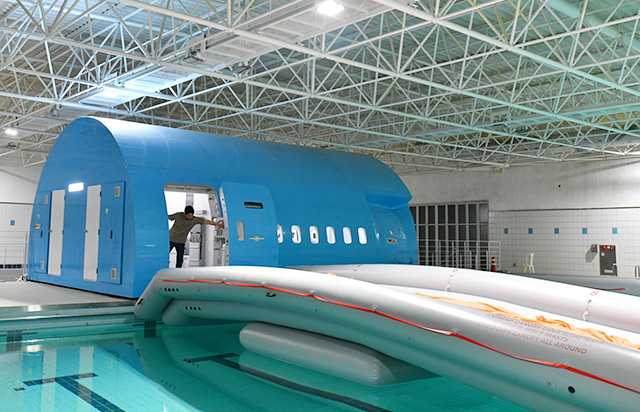 また、韓国内でモバイルバッテリーによる火災が発生したことから、実際の火災を再現できる設備「ファイヤートレーナー」も導入済み。天井から展開される酸素マスクの着用方法や、実物大模型「CEET(Cabin Emergency Evacuation Trainer)」に備えるシューターでの脱出訓練もできるほか、緊急着水を想定した施設では、各機材を再現したドアからプールへ脱出する訓練も学ぶなど、各種有事への対応をたたき込んでいる。
