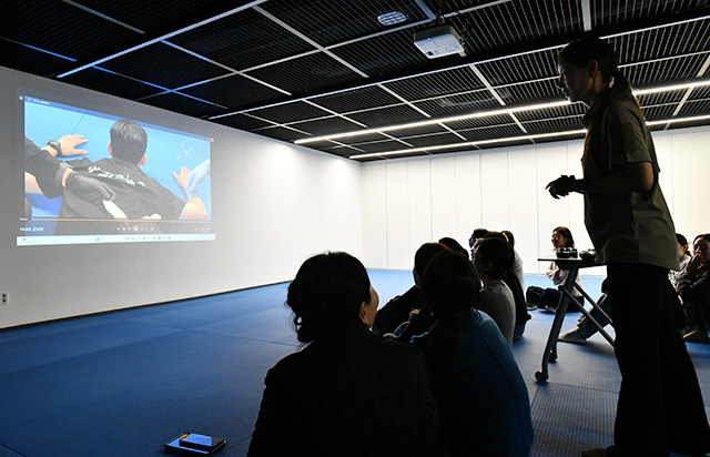 ビデオで訓練を学ぶ大韓航空のCA訓練生=25年11月25日 PHOTO: Yusuke KOHASE/Aviation Wire