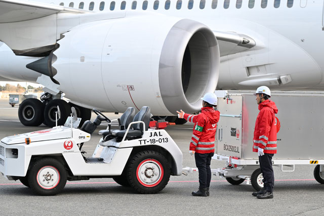 成田空港の外国免許特認制度の第1号となり同乗する教官とトーイングトラクターを出発前に確認するJGSのフウさん(左)=26年1月21日 PHOTO: Tadayuki YOSHIKAWA/Aviation Wire