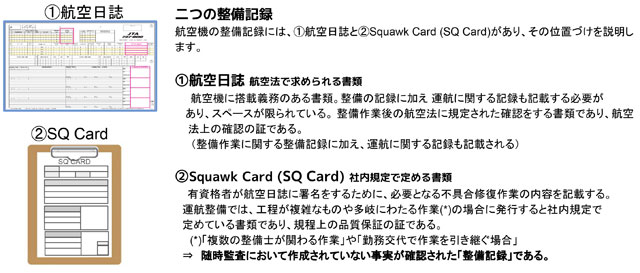 SQカードは、「誰が、どの工程を担当したか」を記録する品質保証のための書類で、シフトをまたぐ作業や、複数の整備士で作業する際、発行を社内で義務付けている。一方、航空法で義務付けられている搭載用航空日誌への署名は行われており、JTAは機体の健全性に問題はなかったとしている。
