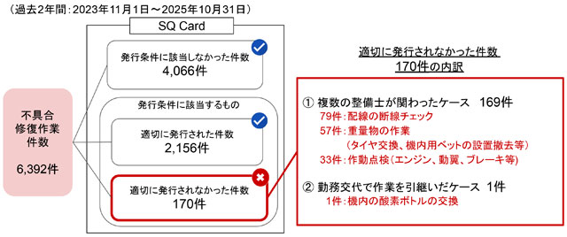 航空局が指摘したのは、不具合箇所の修復など、定例ではない整備作業で発行する社内規定で定めた記録「SQカード(Squawk Card:非定例整備作業記録)」が未作成だった点。2023年11月1日から2025年10月31日までの2年間に行われた不具合の修復作業6392件のうち、SQカードの発行対象となる2326件を調査したところ、170件で作成されていなかった。内訳は「配線チェック」や「タイヤ交換」など複数の整備士による作業が169件、勤務交代時の引き継ぎが「機内の酸素ボトル交換」で1件発生していた。