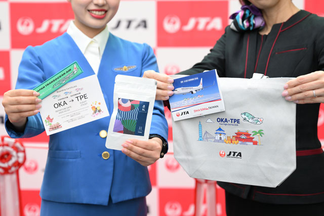 JTA初の国際線、那覇-台北就航 初便はジンベエ3号機、歴代制服で見送り