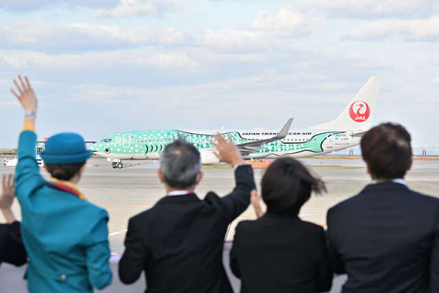 日本航空(JAL/JL、9201)グループで沖縄が拠点の日本トランスオーシャン航空(JTA/NU)は2月3日、同社初の国際線定期便となる那覇-台北(桃園)線を週7往復(1日1往復)で開設した。初便の那覇発台北行きNU301便は、特別塗装機「ジンベエジェット」の3号機「結(ゆい)ジンベエ」(ボーイング737-800型機、登録記号JA07RK)を投入し、歴代制服を着用した社員らが見送った。