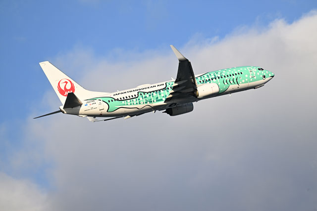 結ジンベエが投入された那覇空港を離陸するJTAの台北行き初便NU301便=26年2月3日 PHOTO: Daigo TAKENOBU/Aviation Wire