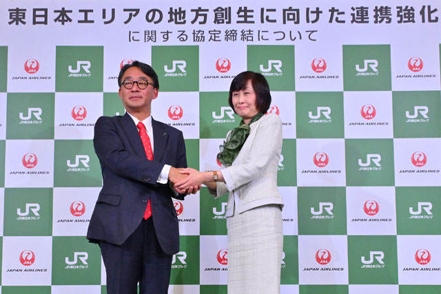 東日本の地方創生に向けた連携協定書に署名し握手を交わすJR東日本の喜㔟陽一社長(左)とJALの鳥取三津子社長=26年2月6日 PHOTO: Tadayuki YOSHIKAWA/Aviation Wire