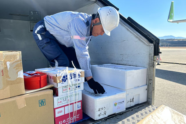 今回のイベントでは、長崎空港を夕方出発する6J36便で羽田空港まで空輸した食材を、都内の飲食店へ当日夜に届ける実証ルートで輸送。九十九島ひらまさや、ブランドいちご(恋みのり、ゆめのか、さちのか)、ナス、サニーレタス、ほうじ茶などを空輸し、羽田では貨物上屋を経由せずに機側でトラックに積み替え、試食会が開かれた東京・四ツ谷の長崎県東京産業支援センターにある、まうまう四ツ谷「長崎歳時記」へ直送した。