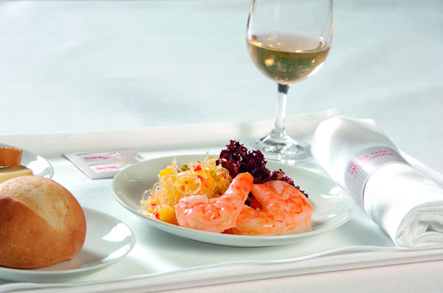 ビジネスクラスでは、フェラトラウトのオレンジソース仕立てや洋梨のコンポートとクーリを添えたアッペンツェラー・ビーバー・ムースを用意。食事とともに、地元産チーズも提供する。飲み物は、この地方で最も有名なビールで、SWRが数年間にわたり全フライトの機内で提供している「Quollfrisch (クヴォルフリッシュ)」とともに、地元産ワインも用意する。