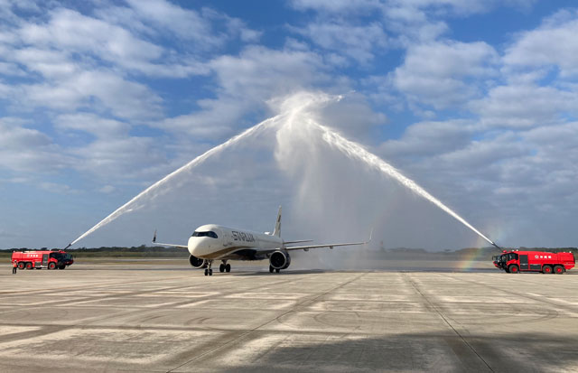下地島空港で消防車の放水アーチによる歓迎を受けるスターラックス航空の台中発定期チャーター初便(下地島エアポートマネジメント提供)
