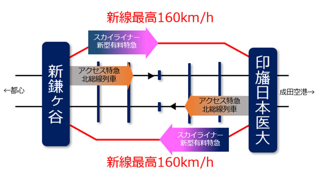 新線側は、時速160キロで走るスカイライナーと新型有料特急の専用線とし、アクセス特急や北総線の一般列車と線路を分離することで、空港アクセスと沿線需要の双方に対応しやすいダイヤ編成を目指す。