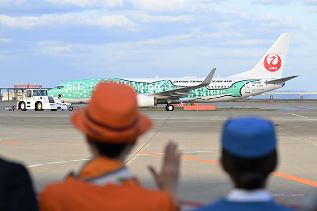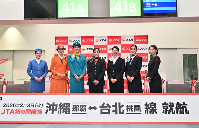 ・JTA初の国際線、那覇-台北就航 初便はジンベエ3号機、歴代制服で見送り(26年2月3日)