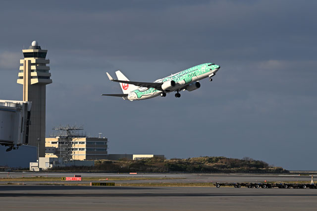 那覇空港を離陸するJTAの結ジンベエによる台北行き初便NU301便=26年2月3日 PHOTO: Daigo TAKENOBU/Aviation Wire