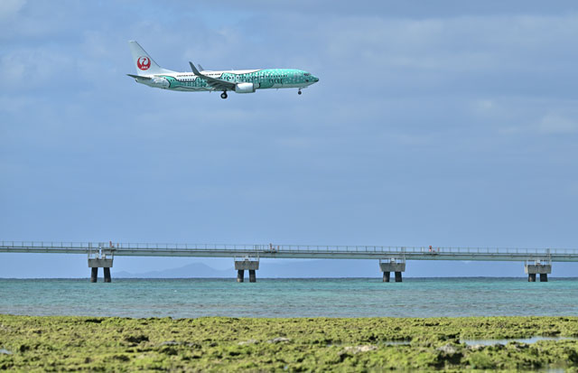 那覇空港に進入するJTAの結ジンベエによる台北発初便NU302便=26年2月3日 PHOTO: Daigo TAKENOBU/Aviation Wire