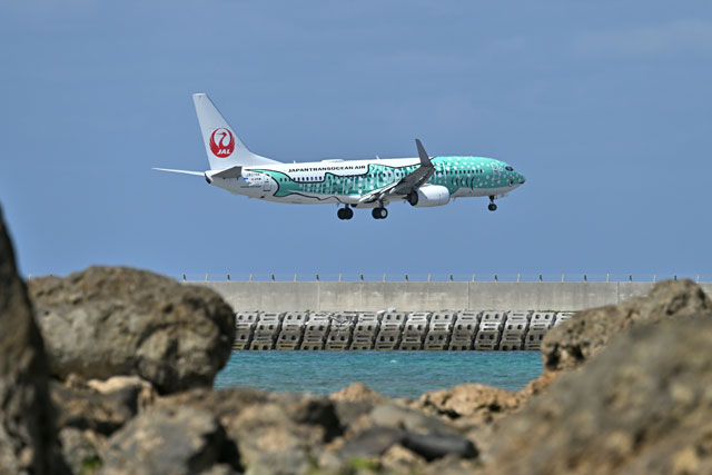 那覇空港に着陸するJTAの結ジンベエによる台北発初便NU302便=26年2月3日 PHOTO: Daigo TAKENOBU/Aviation Wire